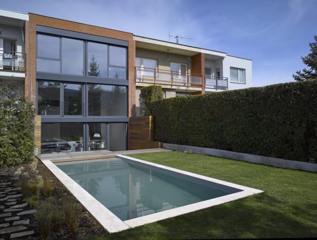 V sedmdesátých letech minulého století byly ve čtvrtích Hanspaulka a Baba vystavěny řadové a bytové domy. Stejně jako v jiných částech Československa, byla bytová výstavba řešena formou svépomocí v rámci, pro tento účel založených, družstev. Výstavba respektovala typizaci své doby, nicméně svažitý reliéf Hanspaulky přinášel zajímavé modifikace. V našem případě měl dům suterén, ze kterého byl díky terénnímu zlomu vstup na zahradu, zatímco vstup z ulice byl o podlaží výše. Po technické stránce byl dům navržen z plných cihel na rozpony panelových stropů, bylo tedy nutné se vyrovnávat s velmi úzkou dispozicí. Charakteristické pro naši oblast bylo použití cihel na fasádě. Jasně vymezené hranice společně se zadáním investora nám určili směr přestavby. Pro navýšení obytné plochy, jsme využili k bydlení i suterén napojený na zahradu. Velmi nízké světlé výšky podlaží nás motivovaly provzdušnit dispozici otevřením jídelny přes dvě patra. Z jihu jsou obytné místnosti prosvětleny velkoformátovým prosklením, které tvoří de facto celou fasádu. Tepelnou pohodu zajišťují venkovní žaluzie, které jsou automaticky řízené. Z ulice – ze severu je zopakován princip z jižní fasády. Velké prosklené plochy zde však z větší části nahrazují plné plechové plochy, za nimiž je garáž a koupelna. Černo-skleněný plášť je zvýrazněn lemem z červených lícových cihel, prvku stmelujícího původní výraz domu s moderní přestavbou.