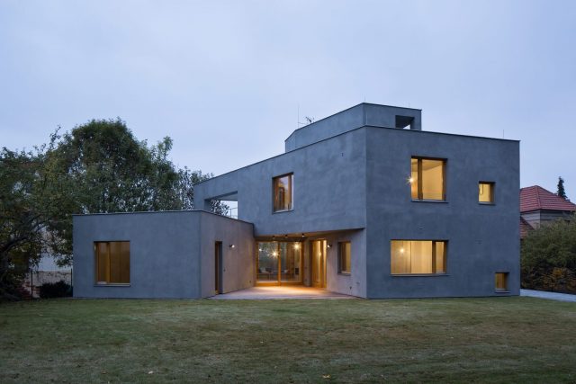 Navržený dům stojí ve vilové zástavbě Ruzyně a Liboce. Půdorysný tvar do písmene U obklopuje venkovní terasu, nabízející pobytový prostor s vysokou mírou soukromí. Dům tímto směrem hledí přes zahradu k oboře Hvězda, která je v jeho těsné blízkosti. Objekt připomínající nepravoúhlý krystal v zeleni zahrady je dvoupodlažní, částečně podsklepený, s plochými střechami a střešní nástavbou. Ústřední roli hraje v přízemí obývací pokoj, který velkými okny propojuje přední a zadní zahradu. Dále se v tomto podlaží nachází kuchyň s jídelnou a pokoj rodičů. První patro je vyhrazeno pro děti. Jejich pokoje mají výstup na střešní terasu. Výrazné materiálové řešení interiéru, užití pohledového betonu v kombinaci s dubovým dřevem, dává vyniknout přirozené kráse materiálu.