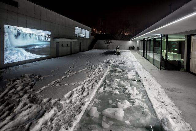 Novostavba rodinného domu se zastavěnou plochou 248 m2 i protější objekt s ateliérem, garáží a vinným sklepem (230 m2) jsou situovány na místo původního tenisového dvorce, zakousnutého do okolního terénu. Dlouhý, ale úzký obytný objekt situovaný na okraji parcely se opticky maximálně otevírá jedinou stranou, a to do atria, kterému tak dodává absolutní intimitu. Z opačné, uliční, strany je totiž atrium uzavřeno původní opěrnou zdí kurtu, již architekt prakticky využil jako základ budovy objektu s ateliérem a garážemi. Mezi oběma objekty tak, pod úrovní blízké poměrně rušné silnice, vzniká prostor dokonale chráněný před ruchem města, který rodině nabízí klidné zázemí a v létě se stává vítaným rozšířením obytných ploch domu. Opticky pak celá kompozice působí jako pevné sevření, které drží rodinu pohromadě. Tuto koncepci architekt zvolil záměrně s ohledem na skutečnost, že se parcela nacházela pod úrovní sousedních parcel, obehnaná opěrnými zdmi bývalého tenisového kurtu a byla bez jakýchkoliv výhledových možností do okolní přírody.