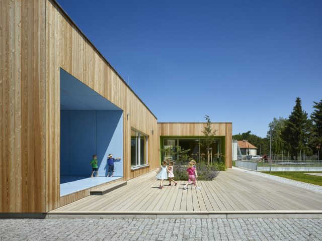 Návrh Mateřské školky v Pacově pojali architekti z VYŠEHRAD atelier velkoryse. Areál zahrnuje hlavní dvoupodlažní budovu a pět jednopodlažních pavilonů, které jsou vůči sobě pootočeny o 90 stupňů, což tvoří polouzavřené prostory ideální pro pohyb dětí. Barevné lodžie a velké dřevěné terasy propojují exteriér s interiérem a vytváří pro uživatele řadu přijemných zákoutí.//VYŠEHRAD atelier’s design for a new Kindergarten in Pacov features a two-storey main building and five single-storey pavilions. These are rotated at 90 degrees towards one another, creating semi-enclosed spaces ideal for children. Colourful loggia and wide wooden terraces establish dialogue between the interior and exterior and offer students and teachers a number of interesting and enjoyable spaces.#schoolarchitecture #kindergarten #czecharchitecture