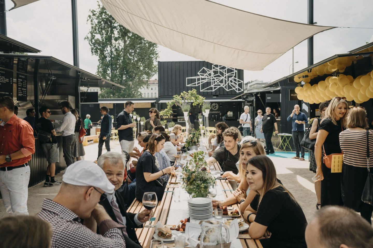 Manifesto, gastronomický a kulturní market, který proměňuje vnitřní periferii v srdci Prahy v nový landmark města. Oživuje zapomenuté místo a nabízí jedinečný mix aktivit pro všechny své návštěvníky. Najdete zde vše od skvělého jídla přes množství kulturních akcí, DJs, letní kino, workshopy, to vše spojující místní obyvatele s návštěvníky z celého světa. Hlavním cílem projektu bylo umožnit lidem prožitek, který nemohou najít nikde jinde, v místě kde by jej čekali nejméně. Market byl navržen jako dočasný a přemístitelný projekt, což v mnohém ovlivnilo jeho architektonickou podobu. Je tvořen na zakázku připravenými obytnými kontejnery, které jsou specificky upraveny pro provoz malých restaurací, barů a prodejen. Díky zvolenému konstrukčnímu systému byl celý projekt postaven a vybaven v průběhu pouhých devíti dní. Členění marketu je inspirováno základním urbánním tvaroslovím města avšak v drobnějším měřítku. Hlavní třída, náměstí, piazzata i „staré město” definují snadno čitelný prostor, který probouzí zvědavost a zároveň umožňuje různorodé využití. Uniformní černé fasády jsou sjednocujícím prvkem celého projektu. Interiéry naopak umožňují individualizaci a sebeprezentaci jednotlivých provozovatelů. Díky velkým výklopným fasádním dílcům mohou provozy komunikovat plně se svým okolím. Výrazný prvek projektu tvoří osm ocelových rámů, které svým umístěním na střeše uliční fronty pomáhají projekt pozvednout a akcentovat uliční fasádu. Rámy spoluvytváří vizuální identitu projektu, umožňují zavěšení rostlin i ikonických stínících membrán, stejně jako ukrytí lineárních prvků osvětlení či případné rozšíření střešních teras. Celková atmosféra je dotvořena použitým mobiliářem, který podporuje různé charaktery a využití jednotlivých míst.