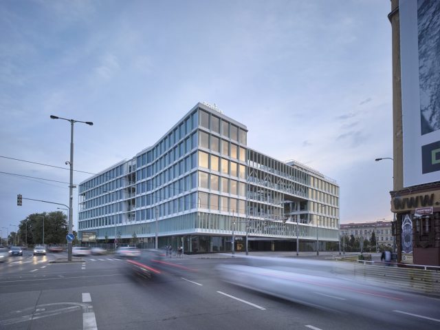 Čtyřicet metrů vysoká kompozice založená na půdorysu pěti zaoblených trojúhelníků se svojí obalovou hranicí přimyká k základnímu rastru ortogonálního systému, který je v území přítomen. Výrazně plasticky tvarovaná fasáda pětice hmot svým půdorysně zakřiveným tvarem nabízí zajímavý a proměnlivý vzhled při pohledu zvenčí. Tento výraz je nezaměnitelný, jasně se odlišující od poněkud unifikovaných plochých prosklených fasád běžných kancelářských objektů. Budova je tímto řešením jednoznačně rozeznatelná od ostatních staveb v lokalitě. Vyzdvižení jedné z pětice hmot (SV nároží) o výšku parteru (respektive její „podříznutí“ zespodu) dává jasnou informaci o poloze hlavního vstupu. Horizontální trojdělení fasády vnáší za pomoci dvou průběžných vodorovných negativních spár do kompozice makroměřítko, které odpovídá taktování dělení ostatních objektů v okolí. Takto popsané horizontální členění se odehrává ve vrstvě předsazených prostorových vertikálních stínících lamel, které ve svém předsunutí a v pohledovém součtu vytvářejí definici obalu jednotlivých hmot. Formování fasád záměrně upouští od klasického členění na oddělení parteru, těla a střešní vrstvy. Jde cestou zjednodušené abstraktní kompozice, která uvedené členění obsahuje spíše v náznacích. Oproti tomu obálka „pojiva“ mezi jednotlivými hmotami – tzn. spojovacích komunikačních krčků je uvažována jako transparentní celoprosklená část opláštění. Neopominutelnou plochou (s ohledem na možnost vnímání stavby z okolních výškových budov) je partie střechy. Jde o plnohodnotnou „pátou fasádu“ domu. Je proto koncipována jako intenzivní střešní zahrada a počítá se s umožněním přístupu uživatelů na tyto plochy. Z toho titulu, že střešní krajina neobsahuje prakticky žádné součásti TZB, je využitelnost zahrady opravdu velkorysá.