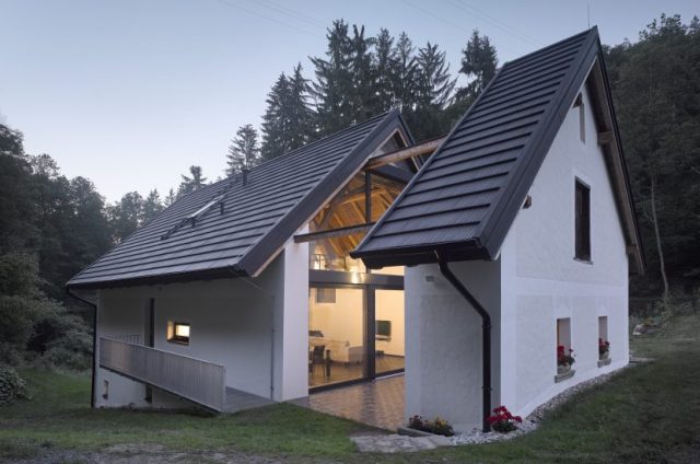 Již od prvního setkání s majiteli bylo jasné zadání, jaké má jejich budoucí bydlení splňovat požadavky: „Má být neotřelé a přitom neokázalé“. Byly jsme teprve na začátku hledání vhodného místa, kde by měl dům stát. Přání bydlení na samotě splnil svou polohou a geniem loci prastarý mlýn u zaniklého rybníku. Po první návštěvě bylo rozhodnuto: „Tady a v tomto domě; nebude se stavět, ale rekonstruovat.“ Stáří mlýn poznamenalo. Léta bez péče, vlhkost a nevhodná dispozice vedla k radikálnímu řešení. Na místo „plastické operace“ razantní „transplantace“. Nikoli povrchní omlazení, ale ozdravení všech zásadních konstrukcí tak, aby se nevytratilo kouzlo staletí. Hlavním úkolem bylo do útrob domu dostat vzduch a světlo. Nikdo si ale nepřál narušit štít, proto jsme „amputovali část trupu“. V původním objemu stavby tak vzniklo patio, kudy do interiéru přes prosklený „řez domem“ vniklo slunce. Hlavní štít se obnažil z obou stran a proudění čerstvého vzduchu jej zbavilo věčné vlhkosti, které by se s obnovením rybníka znásobilo. Stávající krov se zrenovoval. Z obývacího pokoje s kuchyní a jídelnou je možné se stále pohledem na práci předků kochat; prostor je otevřen zrušením stropu přes dvě patra. Vstup do mlýna zůstal na původním místě. Mlýnské kolo bylo vyrobeno tradičním řemeslným způsobem. Celé přízemí včetně patia je dlážděné čedičovou dlažbou. Pečlivým způsobem jsme takto postupně obnovili nebo vyměnili jednotlivé části mlýna tak, abychom splnili vytýčený cíl, nevzít domu krásu stáří. Obrazně přirovnáme naši práci architektů a všech spolupracujících řemeslníků k lékařům, které své pacienty léčí. Stejně jako v jejich v práci je nutné k uzdravení víc. Tím vdechnutím života, tím uzdravením bylo zabydlení novými majiteli. Dům nalezl znovu svoji funkci, smysl života domu.