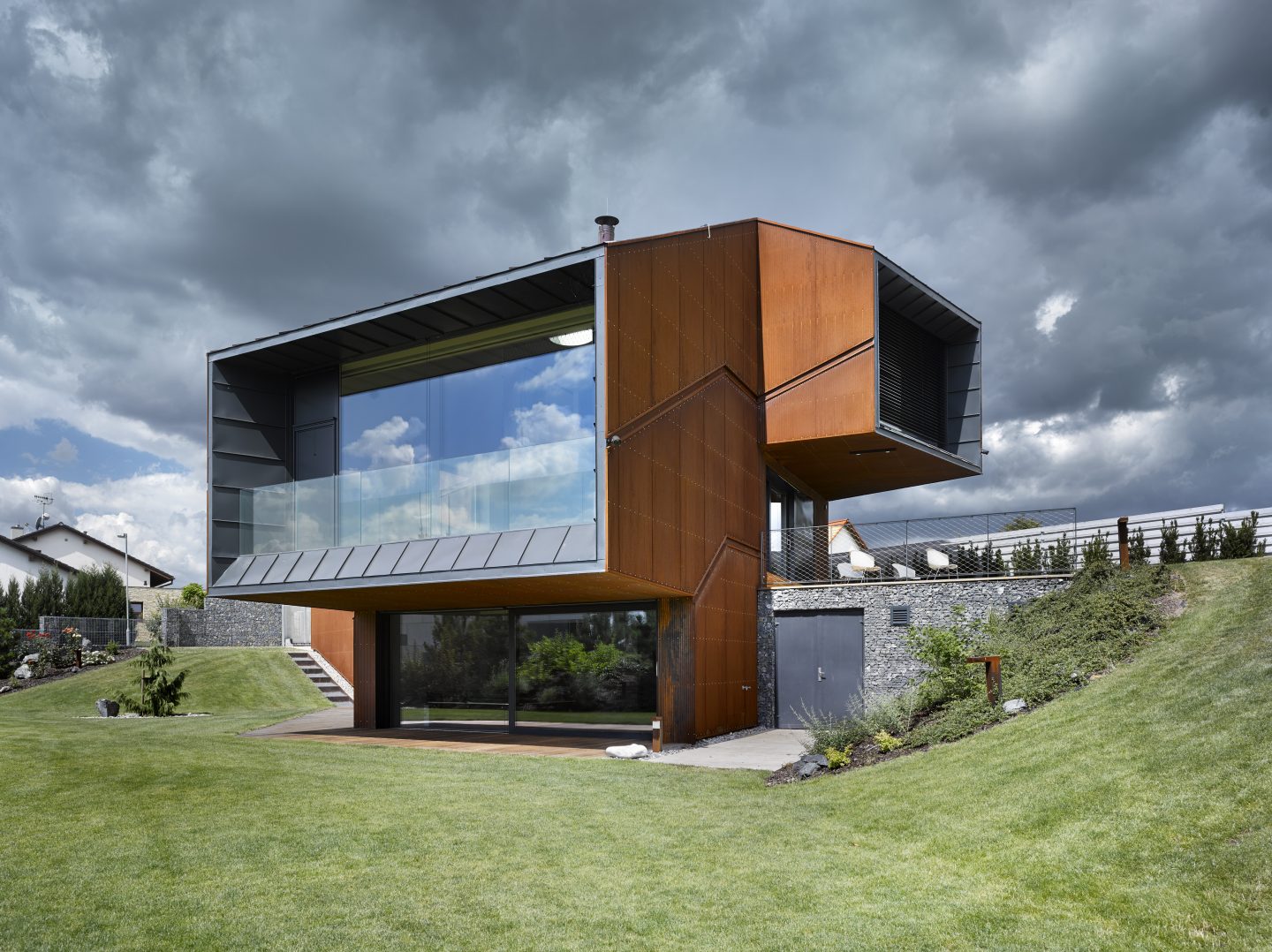 Pozemek se svažuje směrem na jih, přístup je realizován v jeho severozápadním cípu. Na pozemek je navržen dům v půdorysném tvaru „Y“, objekt má kompaktní nepravidelný tvar se dvěma konzolovitě se vysouvajícími objemy. Je orientován podél severní hranice pozemku v 3 metrovém odstupu. První konzola je nasměrována z hlavního obytného prostoru na jihovýchod s panoramatickým výhledem do údolí. Druhá konzola s ložnicí v 2. NP je orientována na východ k pozemku s lesem. Dům je zapuštěn do svahu. Opláštění domu je tvořeno vertikálně orientovaným rezavým plechem Corten s velmi jemnou vlnovkou, objem zahradního skladu je z pohledového betonu. Dům je výškově rozdělen po zhruba půl podlaží do šesti výškových úrovní, které jsou od sebe vždy odděleny jedním schodišťovým ramenem se šesti nebo deseti stupni. Výškové úrovně mají odspodu tyto funkce: vinný sklípek s částí pro hosty, relaxační místnost s tělocvičnou a technickým zázemím, garáž se zádveřím a úložnými prostory, hlavní obytný prostor s jídelnou a kuchyňským koutem, část s dětskými pokoji a nejvýše část pro rodiče. Jednotlivé místnosti jsou v každé úrovni logicky řazeny v návaznosti na centrální chodbu propojenou schodištěm. Samostatnou nezateplenou částí domu je zahradní sklad se střešní terasou (terasou jídelny) umístěnou na východě.